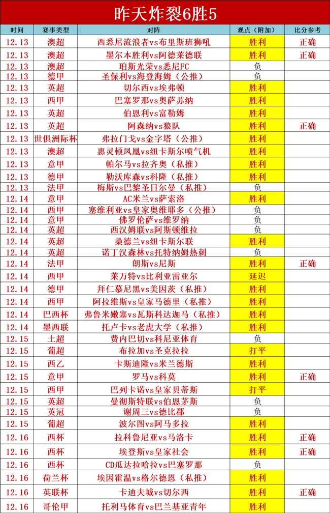 狂胜、狂胜、狂胜,昨天又炸裂,拿下6胜5的佳绩(包含私推),并且命中3场比分,私推再次拿下,私推已经5连胜,继续杯赛继续乘胜追击。